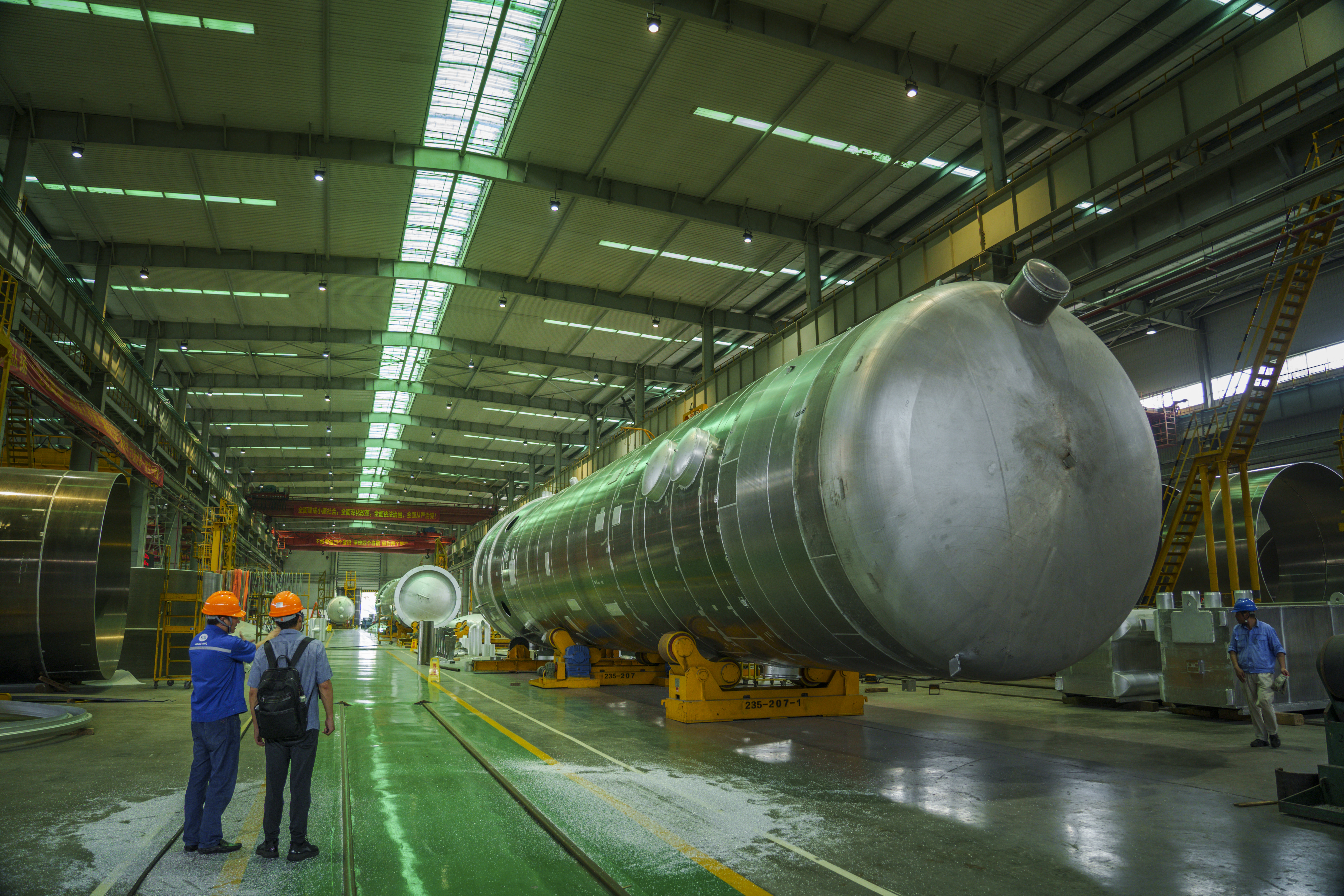 这些直径达4—6米的庞然大物,是空分设备的核心部件。身着全套防护服的焊工冒着高温,在塔器内外一丝不苟地电焊作业。高高的厂房墙壁上,“重器扬国威,大气行天下等字样十分显目。